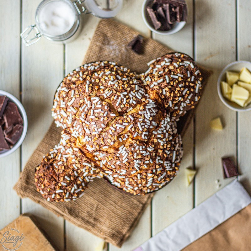Farine de blé tendre type 45, beurre, jaune d'œuf pasteurisé de catégorie A, sucre, chocolat au lait (sucre, beurre de cacao, lait entier en poudre, fèves de cacao, lécithine de soja, extrait naturel de vanille) (7 %), chocolat blanc (lait entier en poudre, beurre de cacao, sucre, lécithine de soja, extrait naturel de vanille) (6 %), levain naturel issu de la pâte mère (farine de blé tendre type 45, eau), chocolat noir (fèves de cacao, sucre, beurre de cacao, lécithine de soja, extrait naturel de vanille) (4 %), liqueur d'amaretto (eau, sucre, alcool, arômes, sirop de glucose), miel d'acacia, pâte de mandarine confite (mandarine, sirop de glucose-fructose, sucre), sel, vanille Bourbon de Madagascar.