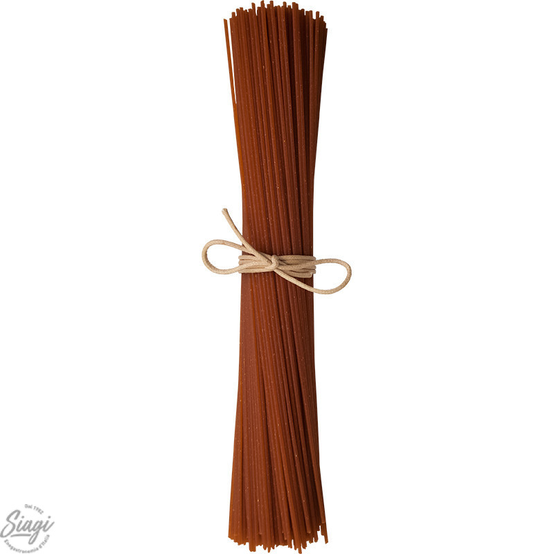 Tonnarelli au piment, pâtes artisanales longues et fines d'environ 24 cm de longueur, plus épaisses que des spaghetti, au piment et au poivron.