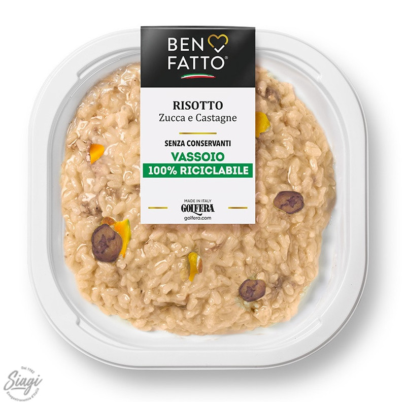 Bouillon de légumes (eau, oignon, CÉLERI, carotte, sel, huile d'olive vierge extra), riz 22%, courge 10%, châtaigne 4%, vin blanc (SULFITES), huile d'olive vierge extra, ragoût d'oignon (oignon, huile d'olive vierge extra), beurre (LAIT), fromage Parmigiano Reggiano AOP (LAIT, sel, présure), amidon de riz, sel, muscade, poivre noir, ail, romarin.