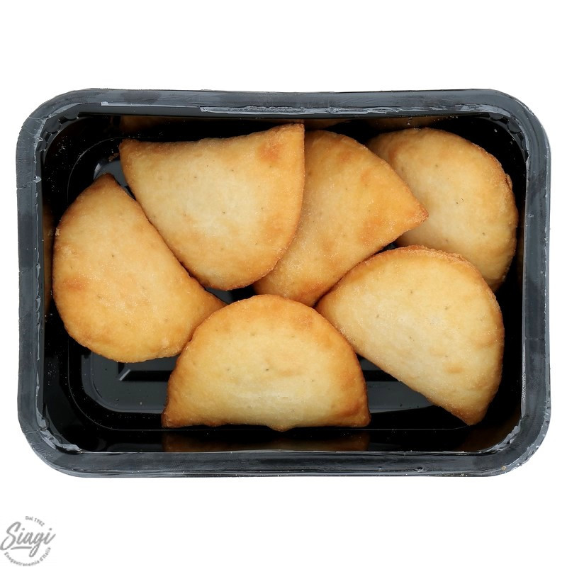 Panzerottini frits, petits chaussons de pâte levée farcis de tomates et mozzarella avec de l'origan . Carton de 4 barquettes de 150 g. Environ 6 pièces par barquette.